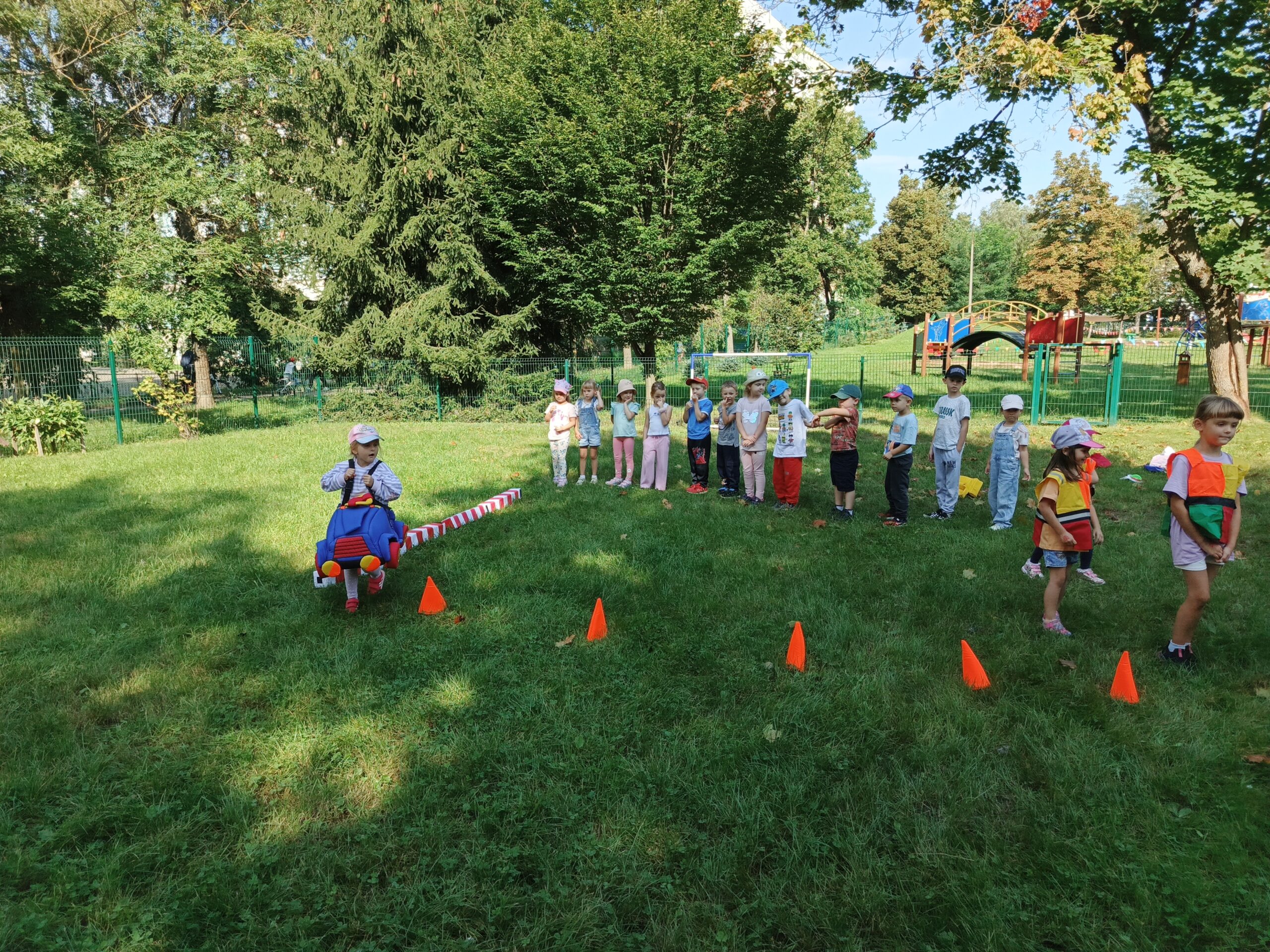 Dzieci biorące udział w zabawach sportowych w ogrodzie przedszkolnym.