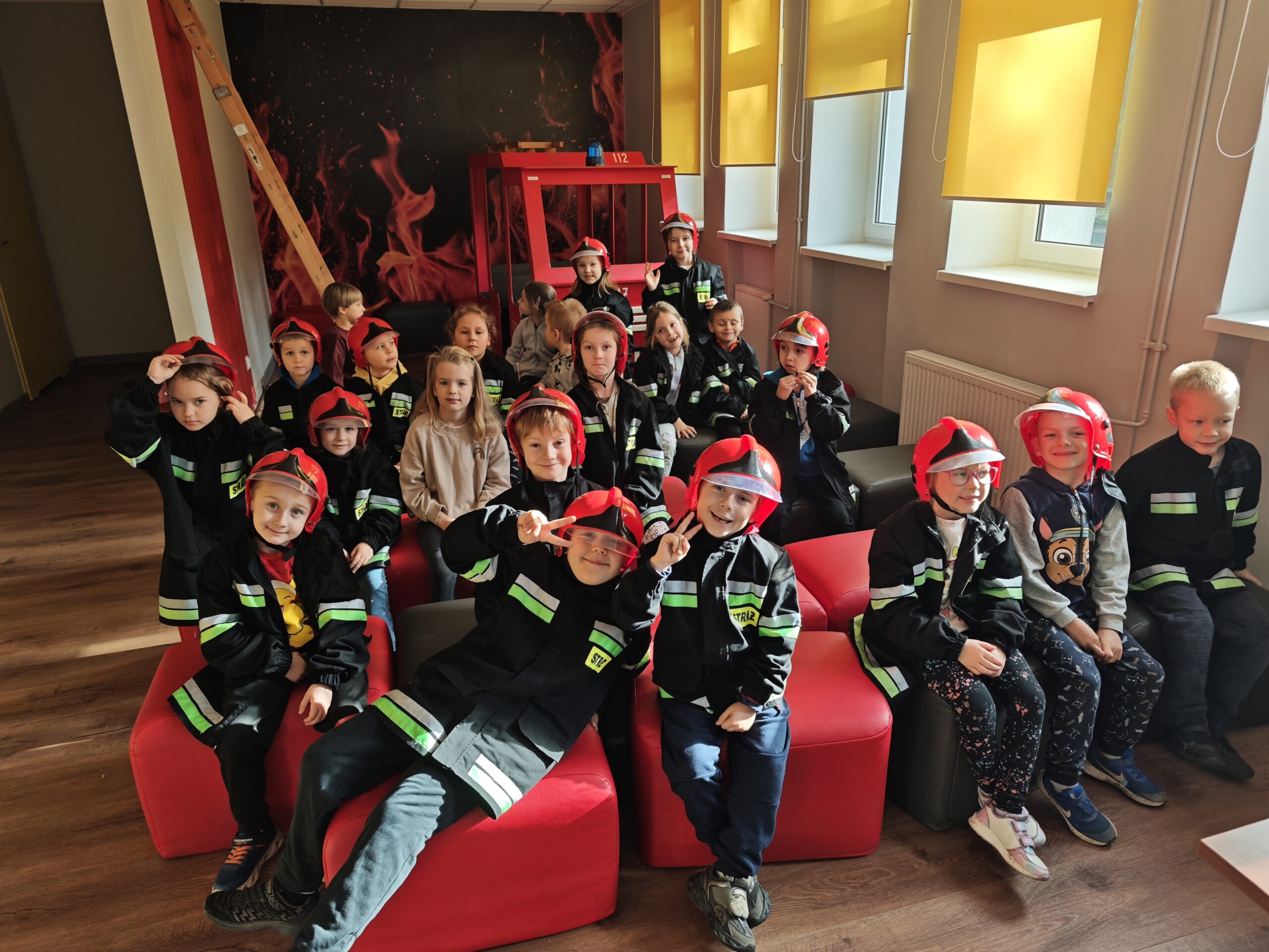 Przedszkolaki w wozie strażackim na sali edukacyjnej.
