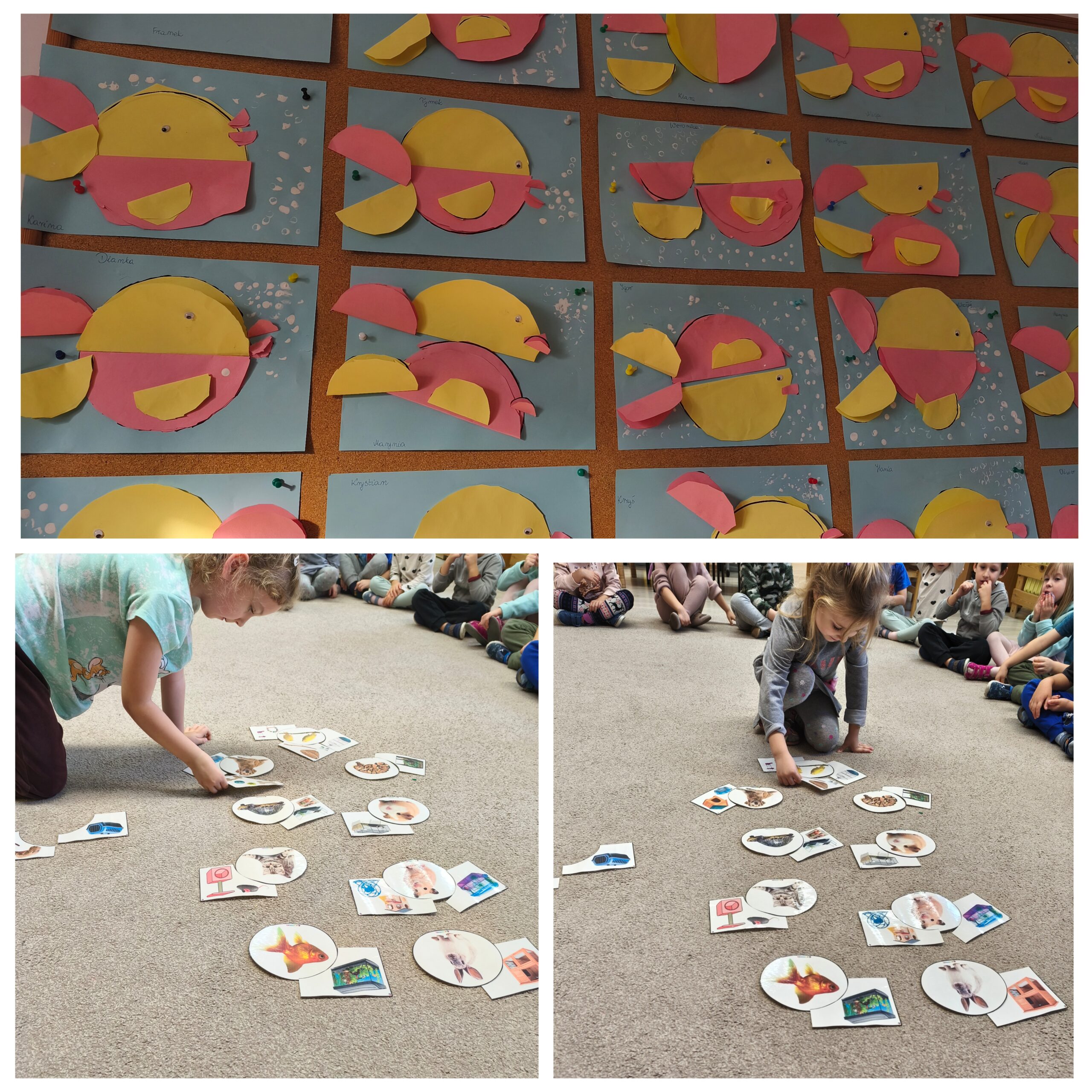 Kolaż ze zdjęciami dzieci układającymi obrazki oraz rybkami origami