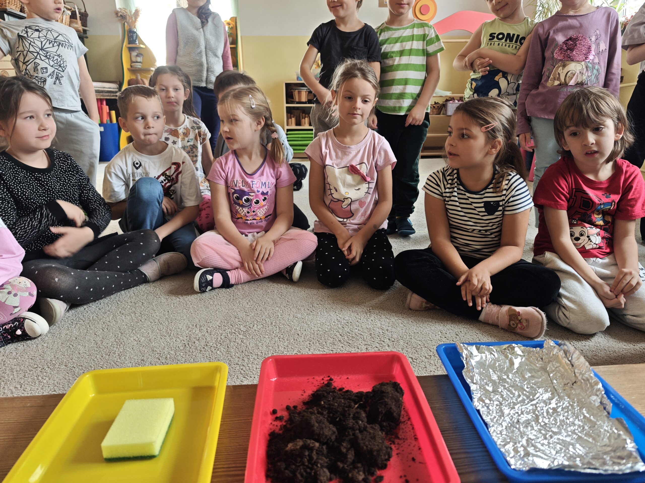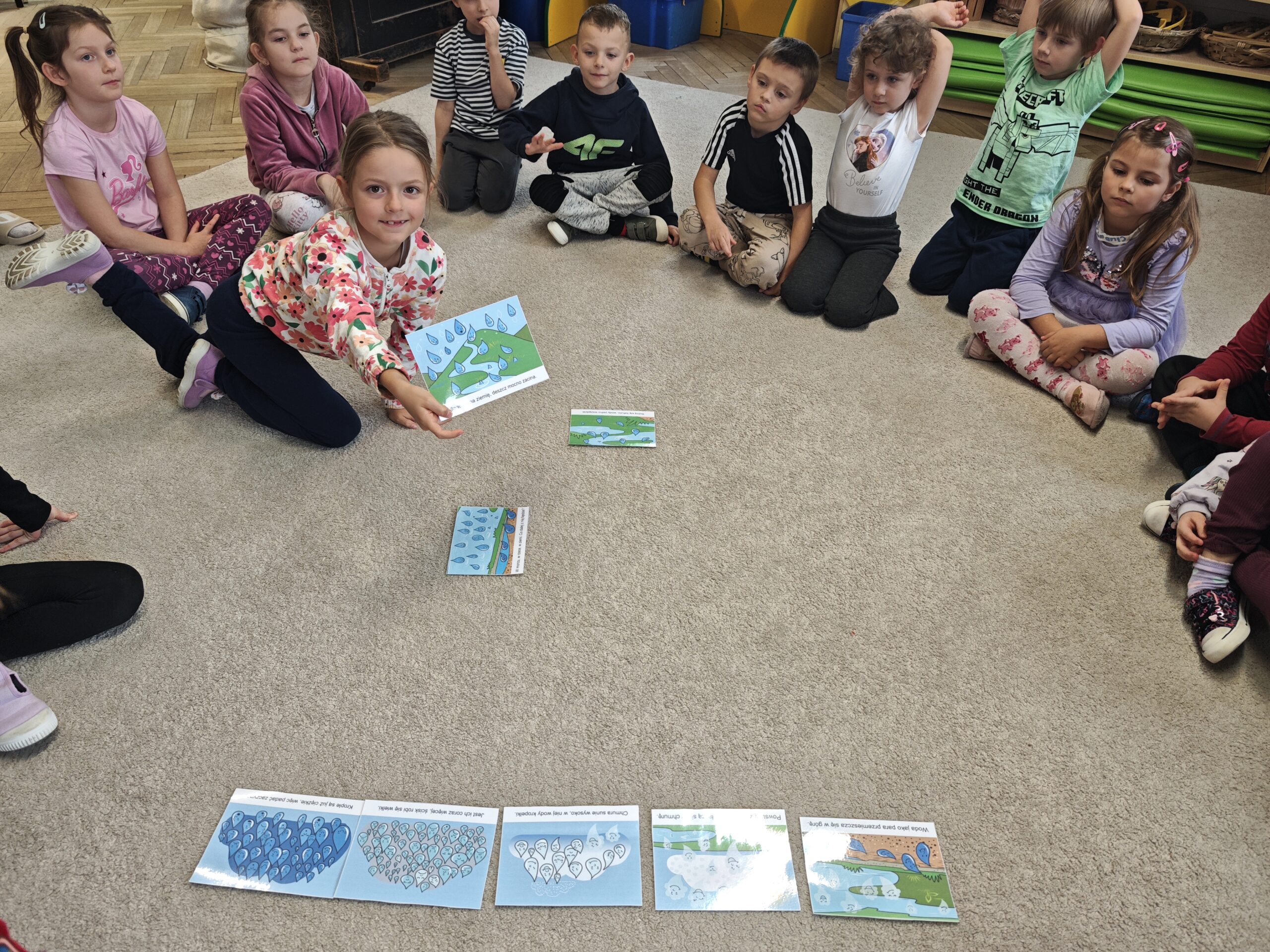 W tym tygodniu przedszkolaki zapoznały się ze zjawiskiem obiegu wody w przyrodzie oraz jej znaczeniem dla życia na ziemi.