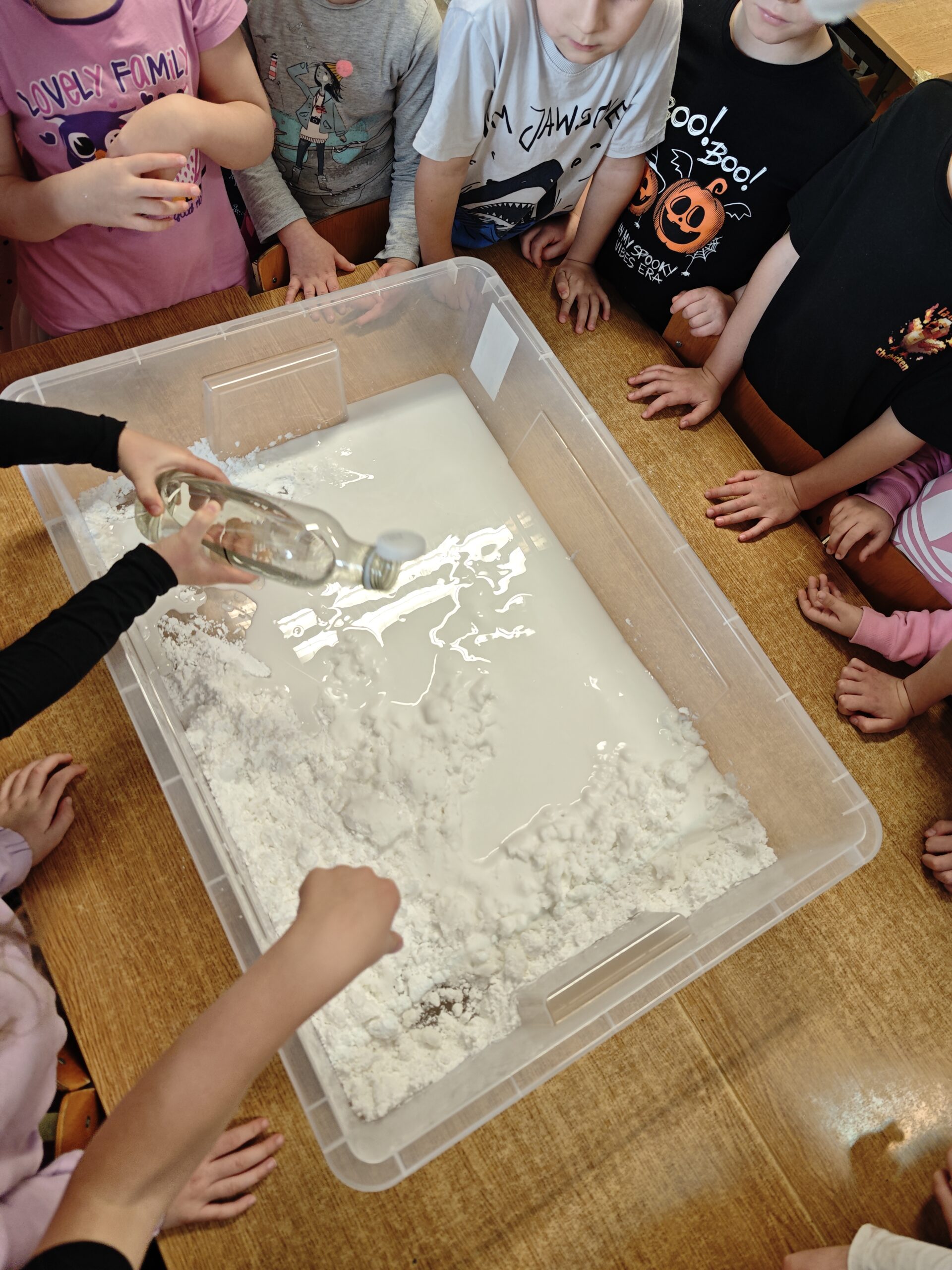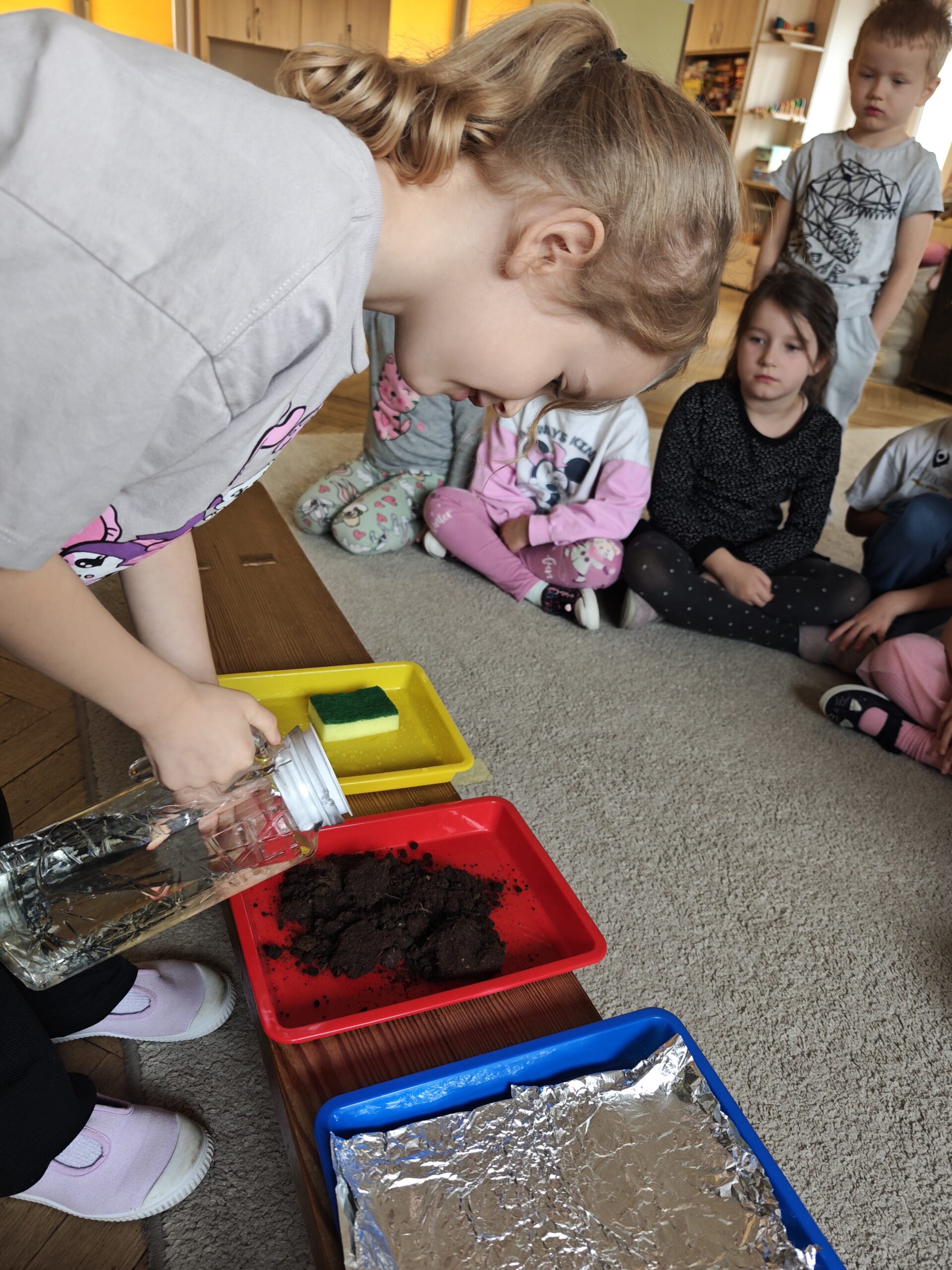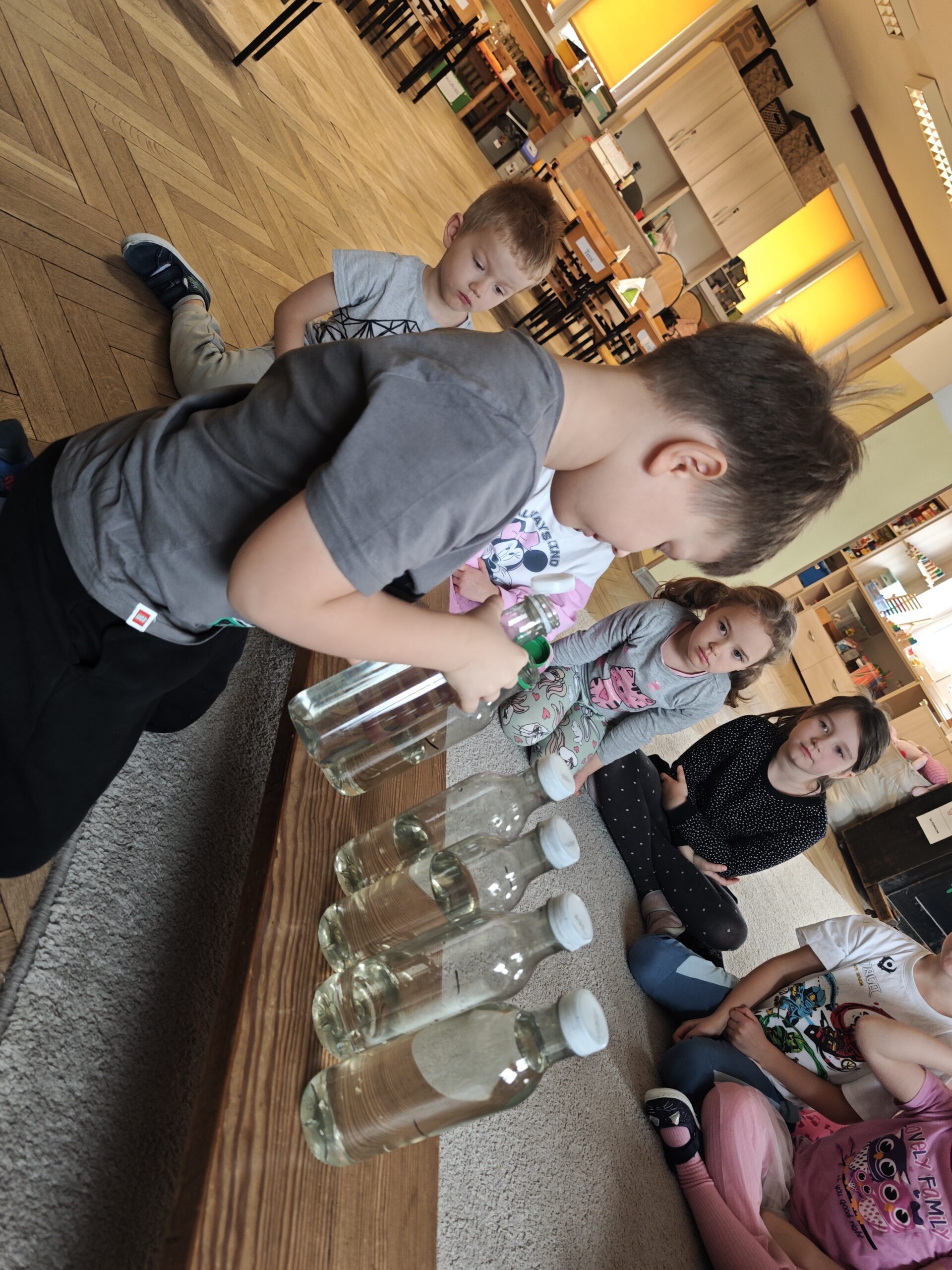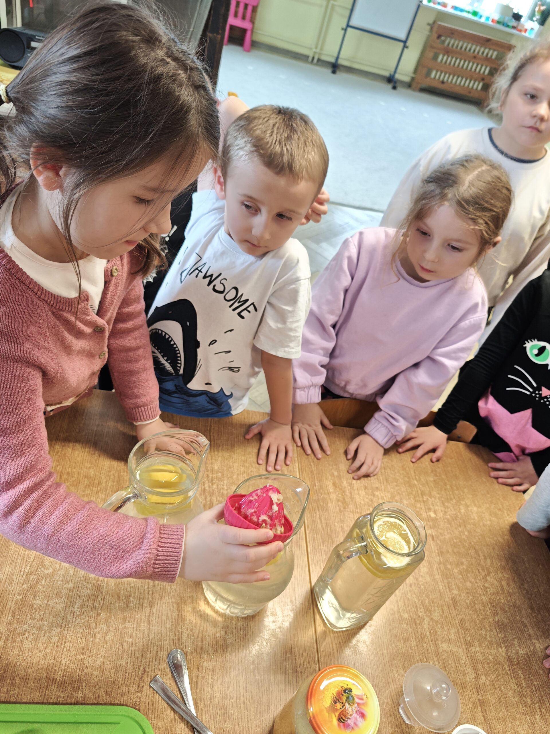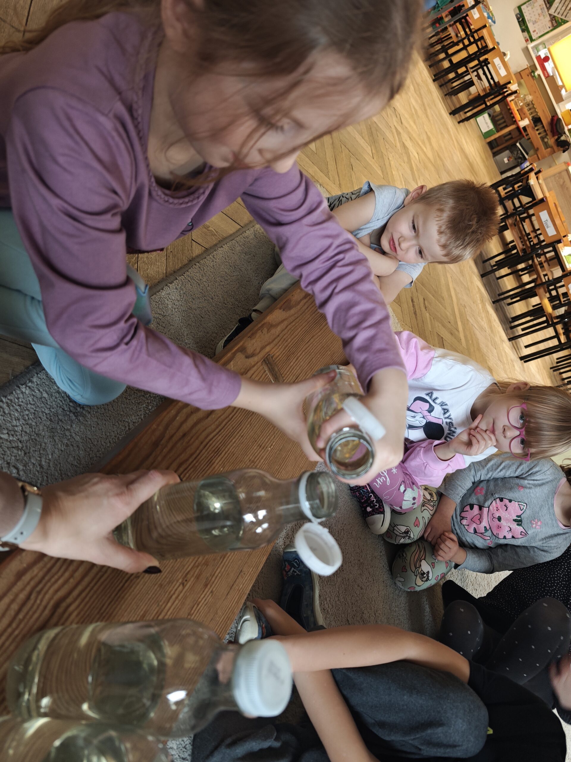 Wykonywaliśmy różnorodne doświadczenia i eksperymenty, doskonaląc przy tym nasze umiejętności matematyczne (odmierzanie, porównywanie ilości płynu) oraz zręczność (przelewanie, odkręcanie i zakręcanie butelki).