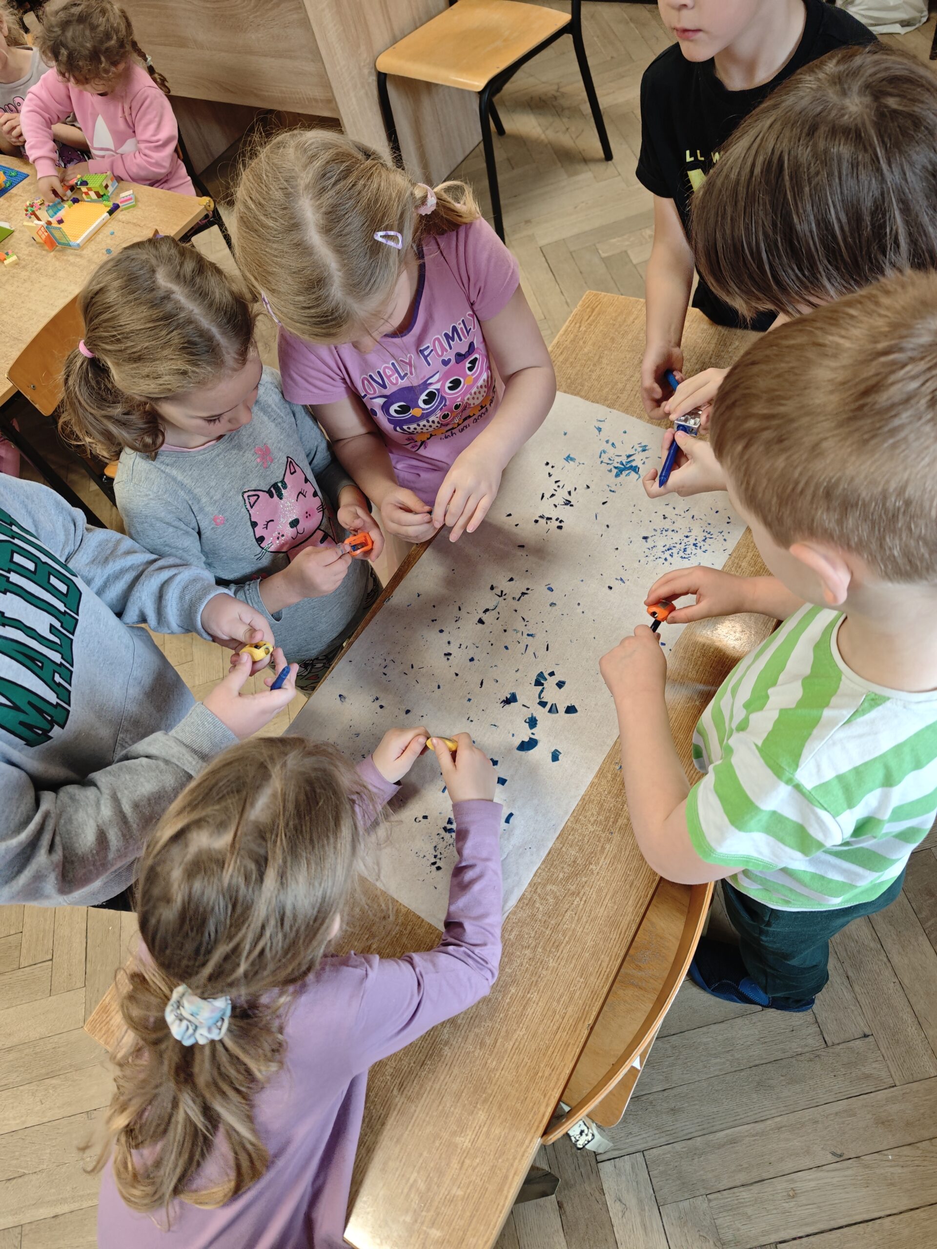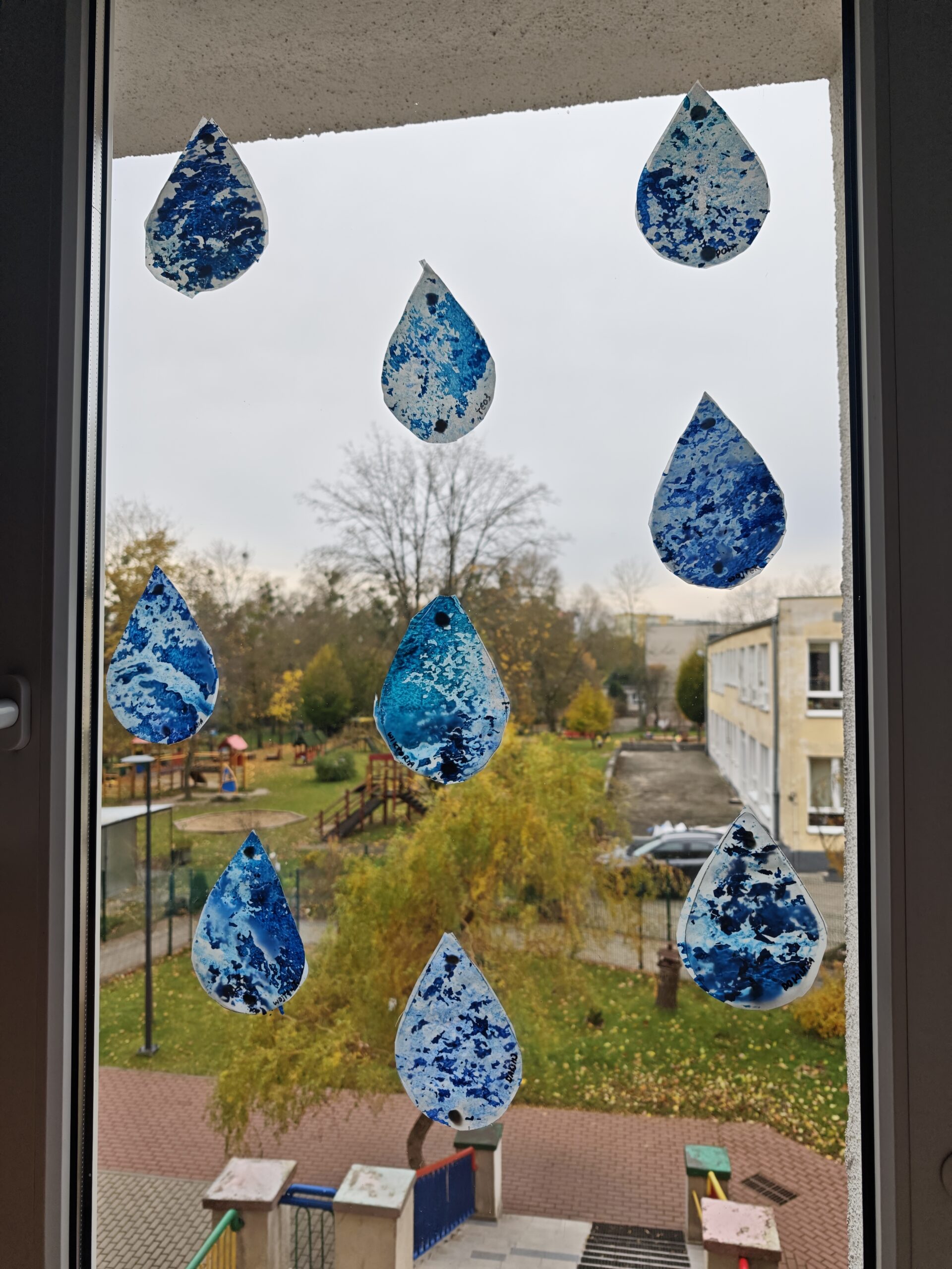 Eksperymentując i doświadczając nowej techniki plastycznej stworzyliśmy łapacze słońca, świecowe krople deszczu.