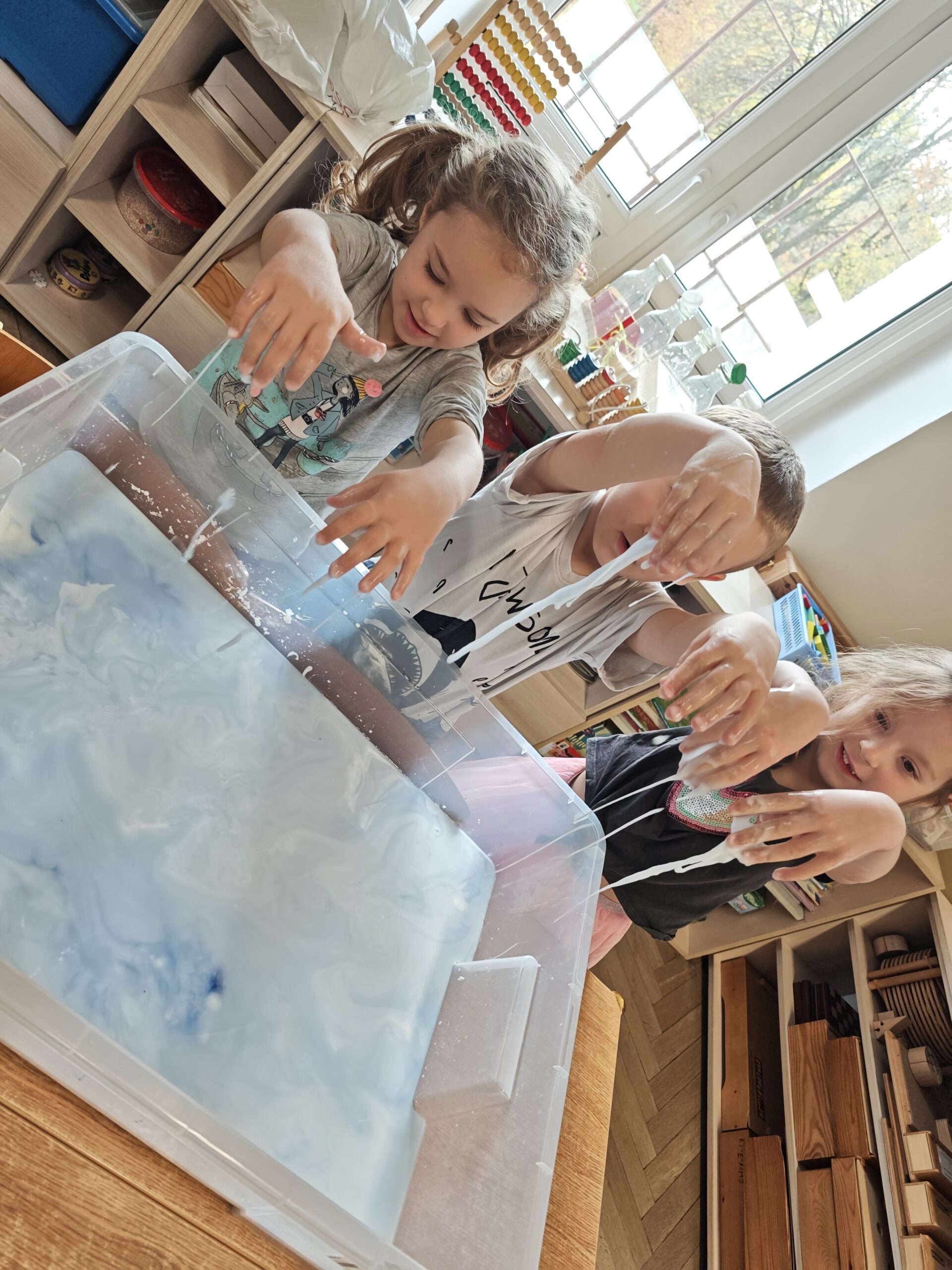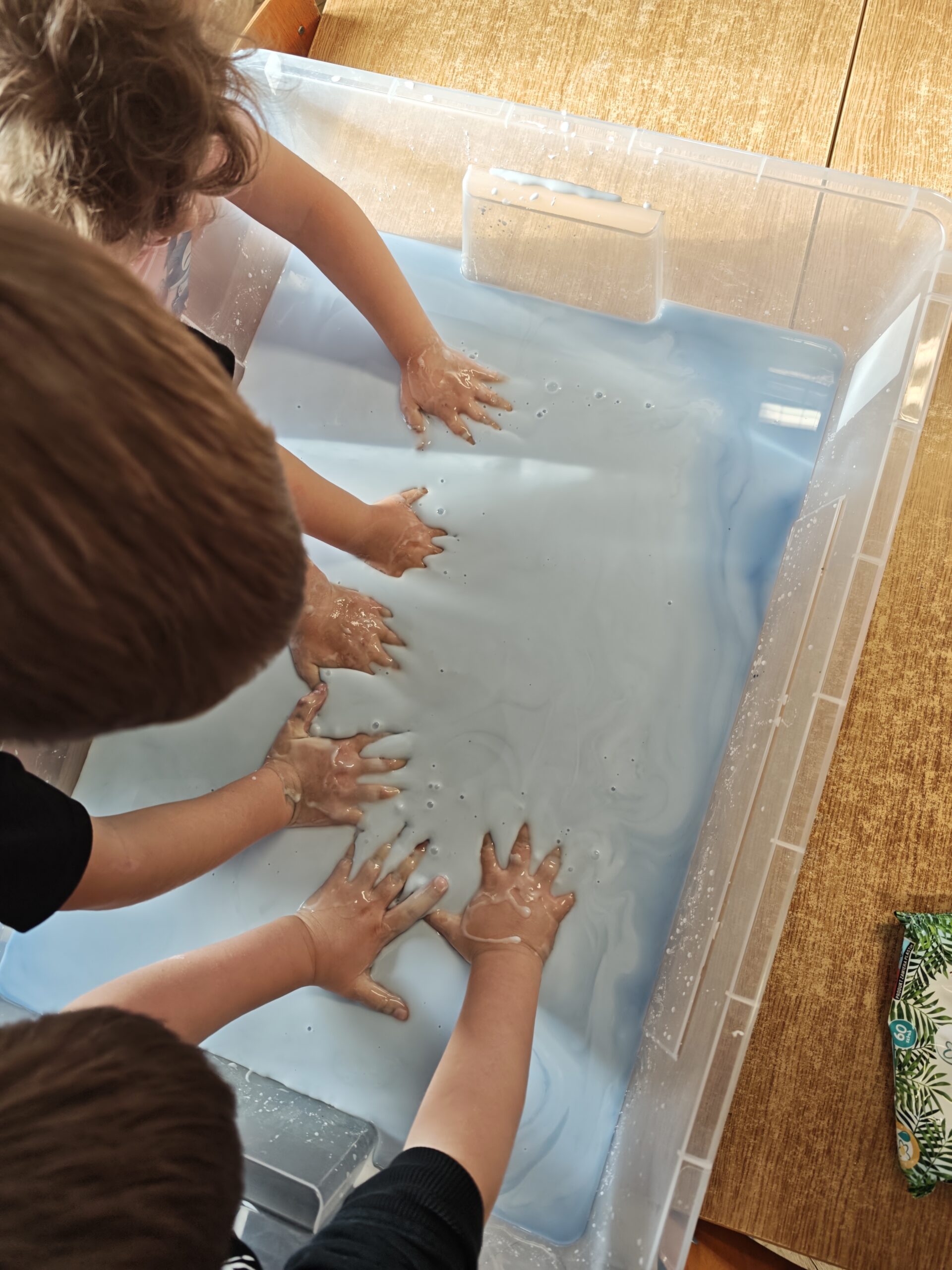 I to co uwielbiamy najbardziej! Zabawy sensoryczne przy których możemy trochę się pobrudzić 🙂 mąka ziemniaczana+woda+barwnik. Powstaje wspaniała ciecz nienewtonowska 🙂