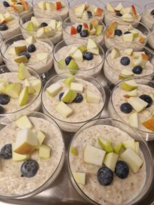 Podwieczorek | Zupa krem z dynii z prażonymi pestkami dynii. /1,7/ DZIEŃ OWSIANKI – Owsianka z jogurtem naturalnym i owocami (borówka, gruszka, banan, jabłko). /1,7/ |