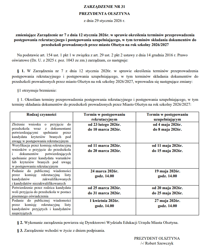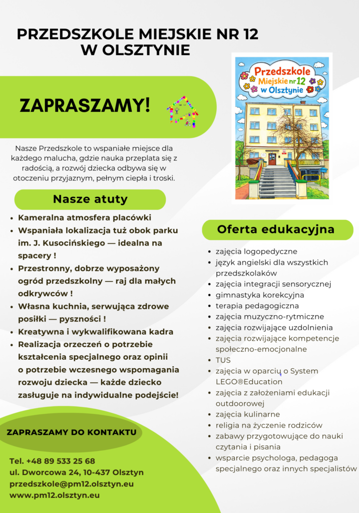 Informujemy, że rekrutacja do Przedszkola Miejskiego Nr 12 w Olsztynie na rok szkolny 2026/2027