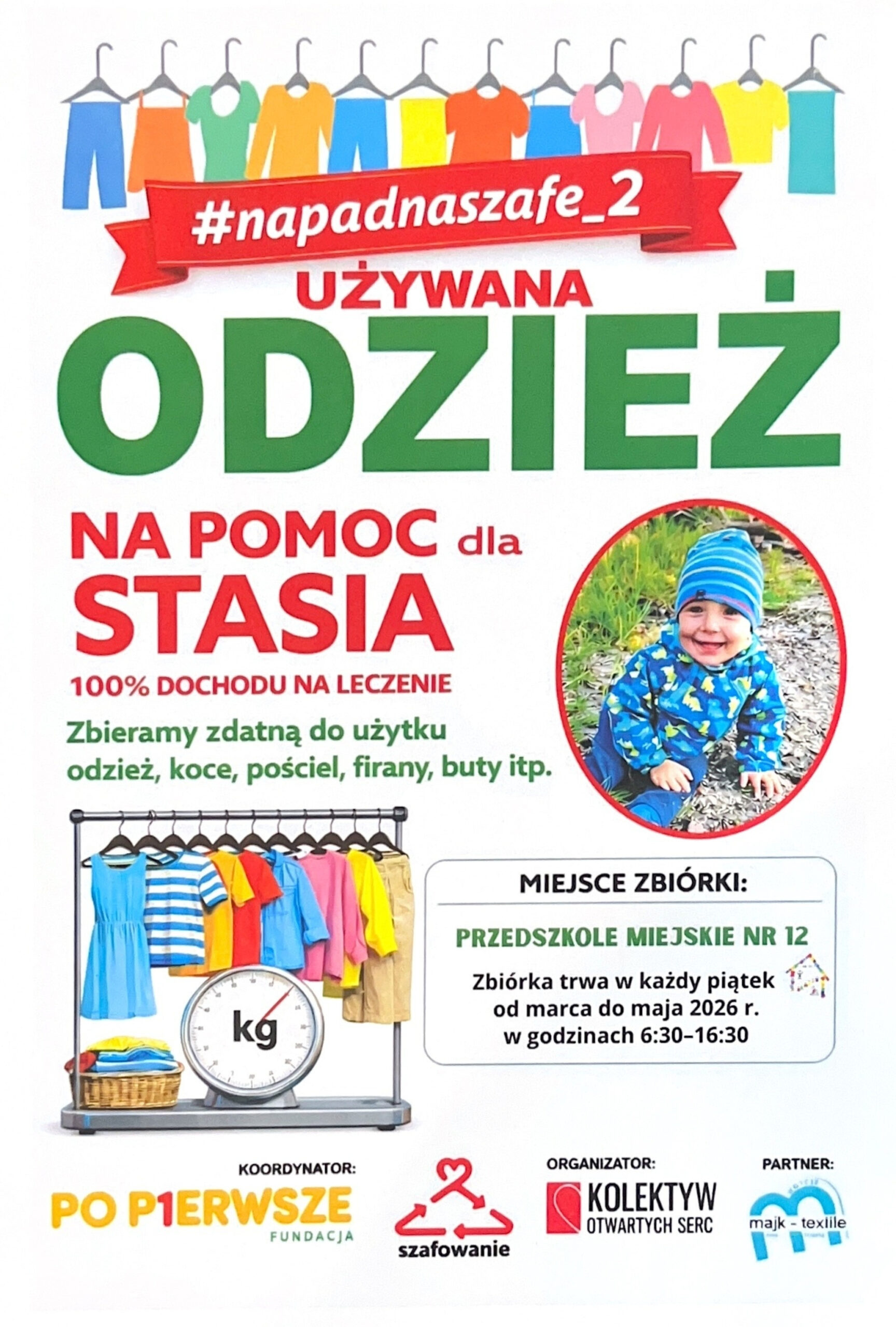 Nasze przedszkole dołączyło do akcji #napadnaszafe_2 – zbieramy używane tekstylia, by pomóc w leczeniu Stasia. Celem zbiórki jest danie ubraniom drugiego życia, a 100% dochodu z ich sprzedaży zostanie przeznaczone na leczenie Stasia.