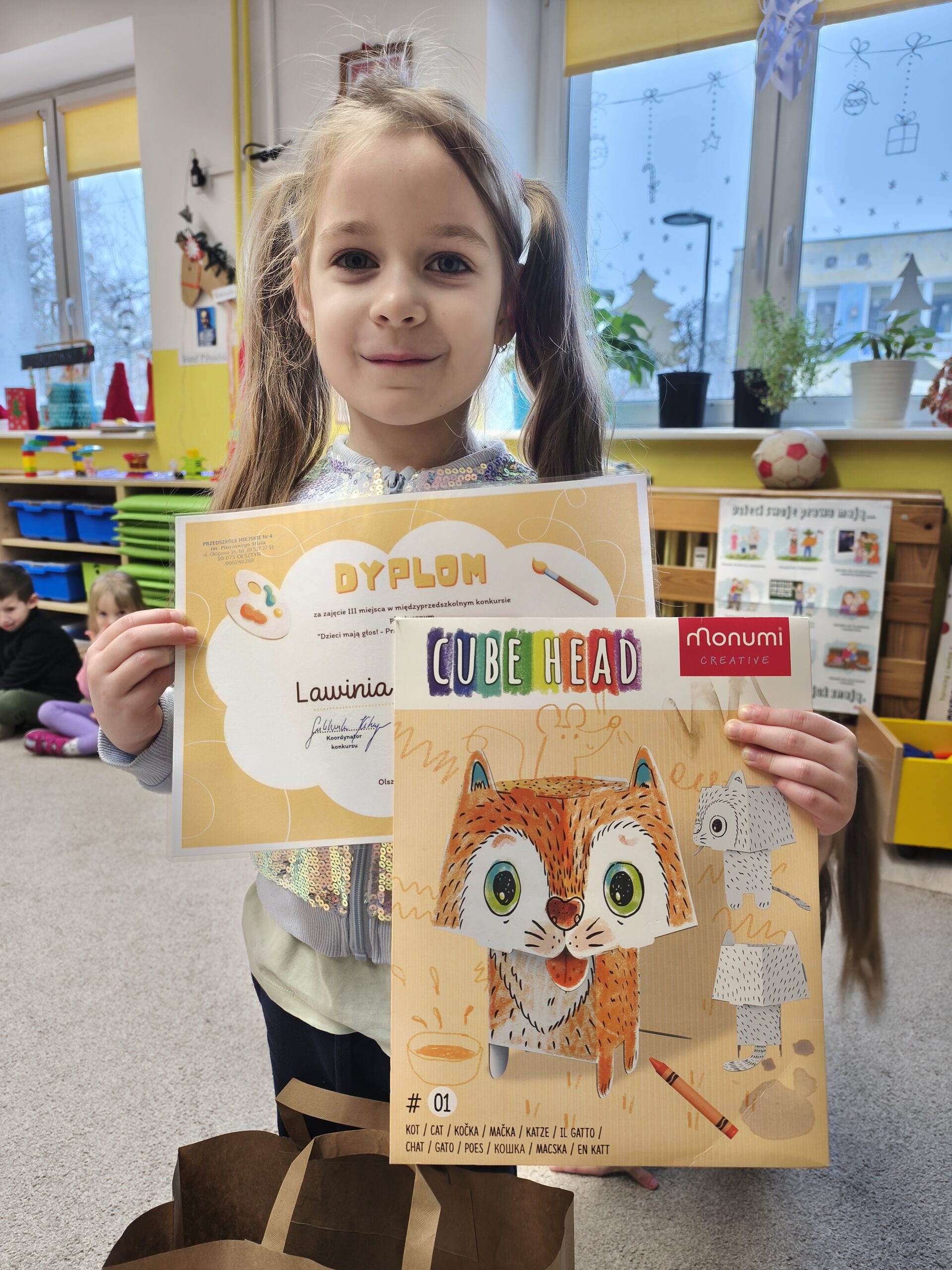 Lawinia z grupy III zajęła III miejsce w Międzyprzedszkolnym Konkursie Plastycznym „Dzieci mają głos- prawa i obowiązki oczami dziecka” organizowanym przez Przedszkole Miejskie nr 4 im. Pluszowego Misia w Olsztynie.